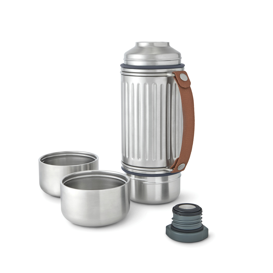 A 1L vacuum-sealed stainless steel flask with a leak-proof design, durable carry handle and an easy-pour mechanism. Keeps drinks hot for up to 5 hours or cold for up to 15 hours, and includes 2 stainless steel cups that fit to the top and bottom for simple serving on the move.