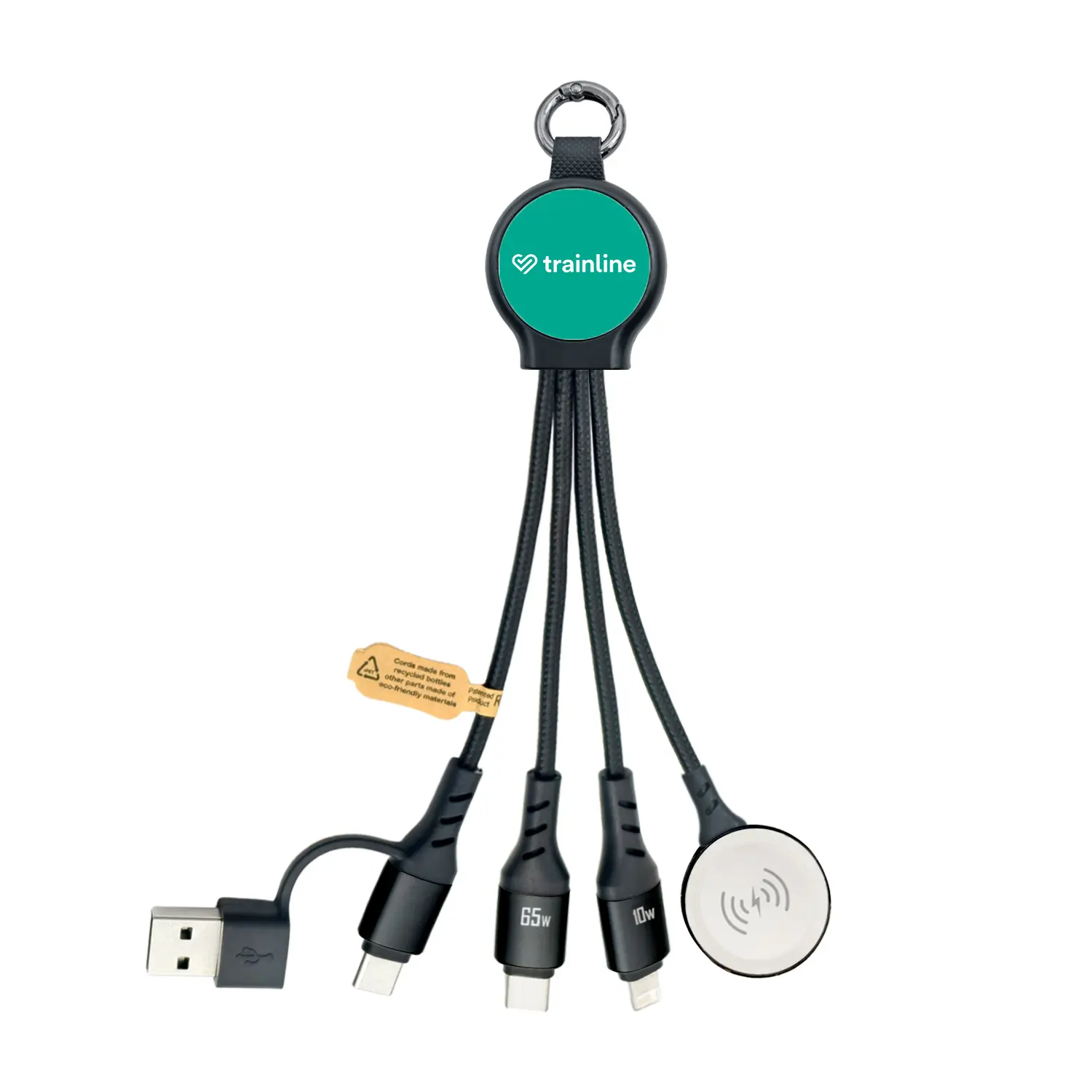 The Light Speed Mini Pro ECO Charging Cable is a pocket-sized, multi-device charging solution with 65W fast charging capability. Featuring multiple connectors, a Type-C cable, and a 2.5W watch charger, it powers all your essentials in one compact design. Made from 78.2% sustainable materials and customisable with full-colour or LED branding, it’s perfect for everyday use and promotions.