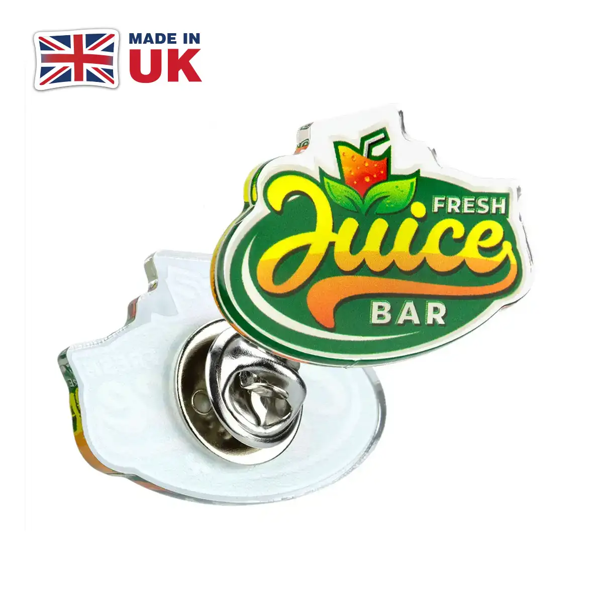 Custom-made promotional acrylic pin badges manufactured in the UK, crafted from 2mm thick recycled clear acrylic. These full-colour printed badges are cut to any bespoke shape and size up to 35mm x 35mm.